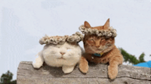 Paglalarawan ng Content: two cats wearing flower crowns sit on a log