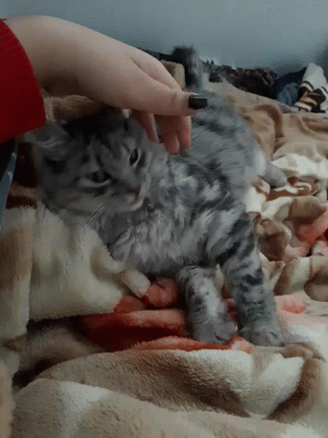 Paglalarawan ng Content: a person petting a gray cat on a blanket
