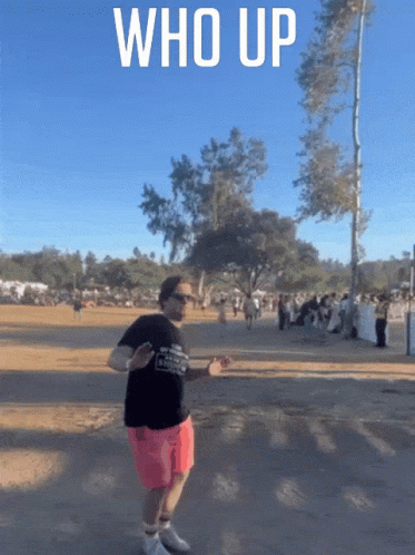 Paglalarawan ng Content: a man in a black shirt and pink shorts is dancing in front of a sign that reads who up