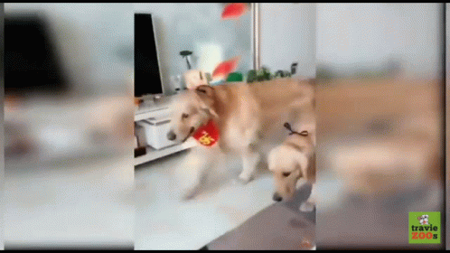Paglalarawan ng Content: two dogs are standing next to each other in a living room playing with a ball .