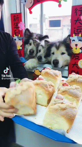 Paglalarawan ng Content: a person is holding a loaf of bread in front of a window with three dogs looking out