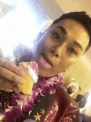 Paglalarawan ng Content: a man wearing a lei is eating a cupcake with his tongue hanging out