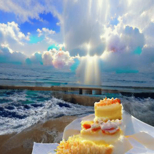 Paglalarawan ng Content: a piece of cake sits on a plate on the beach with the ocean in the background