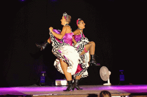 Paglalarawan ng Content: two women in zebra print skirts are dancing on a stage with a fan in the background