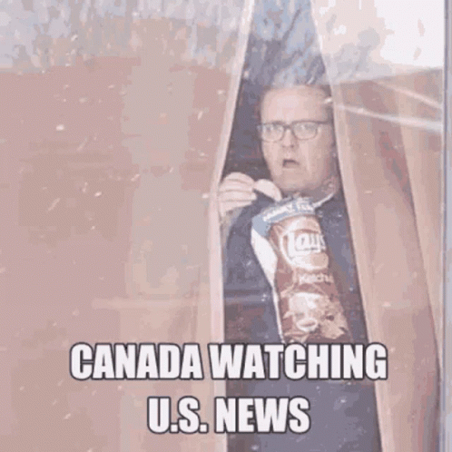 - Paglalarawan ng Content: a man eating a bag of lays chips while looking out a window with the caption canada watching u.s. news