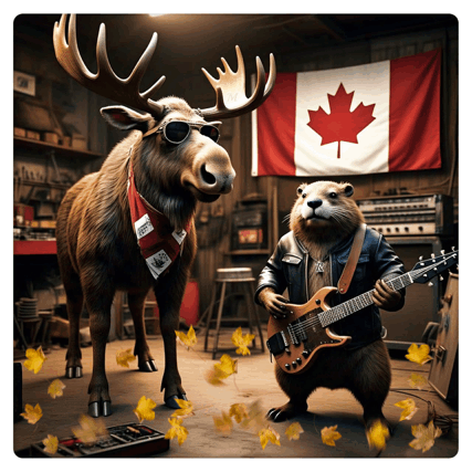 Paglalarawan ng Content: a moose and a beaver are standing in front of a canadian flag