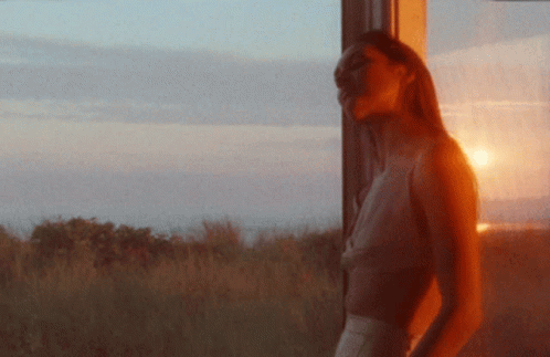 Paglalarawan ng Content: a woman stands in front of a window looking out at the sunset
