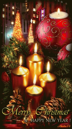 Paglalarawan ng Content: a merry christmas and happy new year greeting card with candles and pine cones