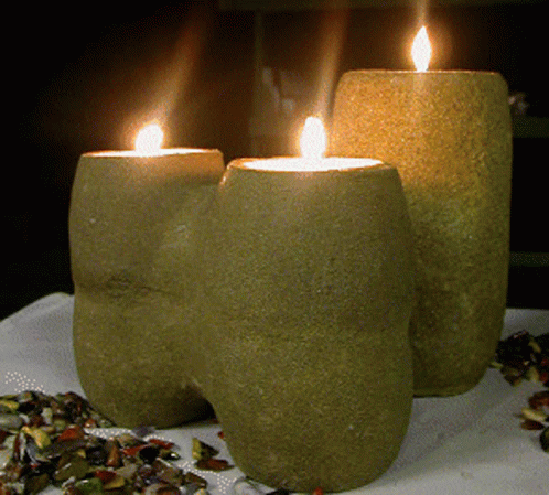 Paglalarawan ng Content: three lit candles are sitting on a table next to a pile of rocks