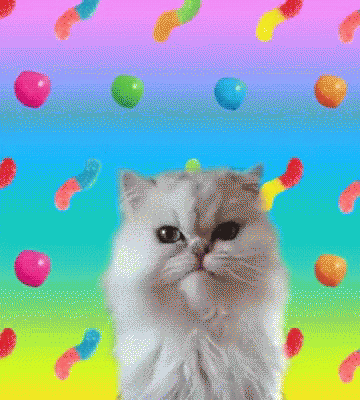 Paglalarawan ng Content: a cat is surrounded by colorful jelly beans on a rainbow background