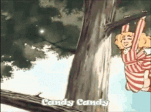 Paglalarawan ng Content: candy candy hanging from a tree branch with her arms in the air