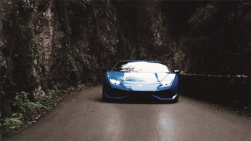 Paglalarawan ng Content: a blue car is driving down a road with trees on the side