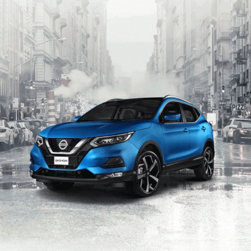 Paglalarawan ng Content: a blue nissan qashqai is parked on a rainy city street
