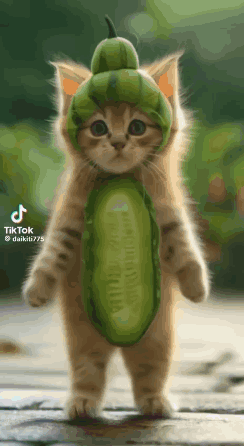Paglalarawan ng Content: a kitten is wearing a cucumber costume and standing on a wooden surface .