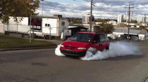 Paglalarawan ng Content: a red minivan is driving down a street with smoke coming out of it