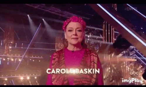 Paglalarawan ng Content: a woman in a pink dress is standing on a stage with the name carole baskin on the screen .