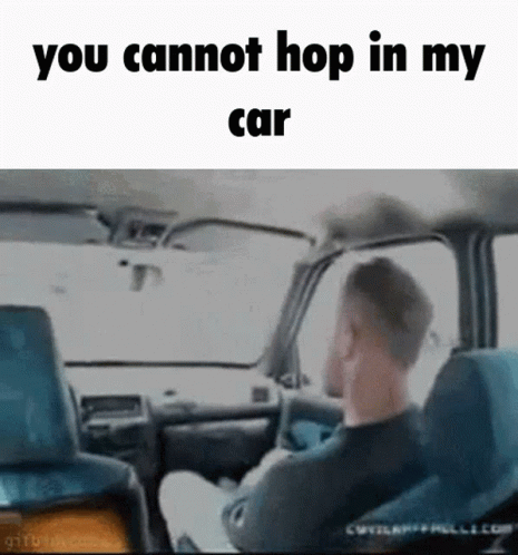 Paglalarawan ng Content: a man driving a car with the words you cannot hop in my car