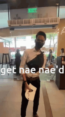 Paglalarawan ng Content: a man wearing a mask holds a piece of paper with the words get nae nae 'd written on it