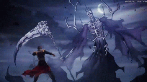 Paglalarawan ng Content: a man with a scythe is standing in front of a skeleton .