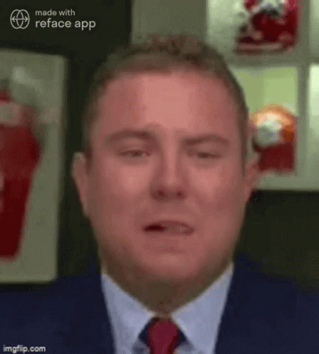 Paglalarawan ng Content: a man in a suit and tie is crying in front of a wall of football helmets .