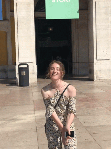 Paglalarawan ng Content: a woman stands in front of a building with a green sign that says store