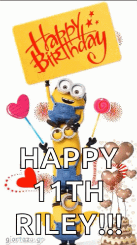 Paglalarawan ng Content: a minion holding a sign that says happy birthday and happy 11th riley