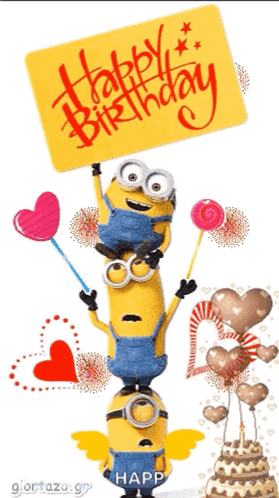 Paglalarawan ng Content: a happy birthday card with minions holding up a sign