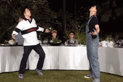 Paglalarawan ng Content: two men are dancing in front of a table with a bottle of water