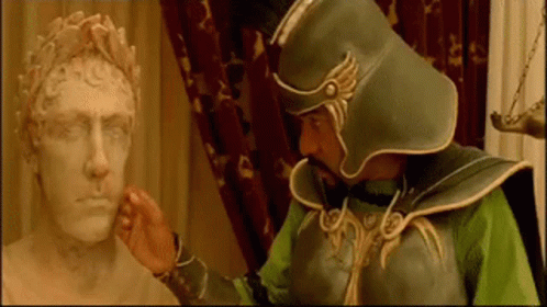 Paglalarawan ng Content: a man in armor touching a statue of a man 's face