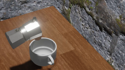 Paglalarawan ng Content: a cup of coffee sits on a wooden table next to a silver coffee maker