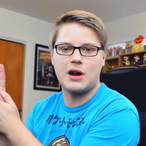 Paglalarawan ng Content: a man wearing glasses and a blue shirt that says ' pokemon ' on the front