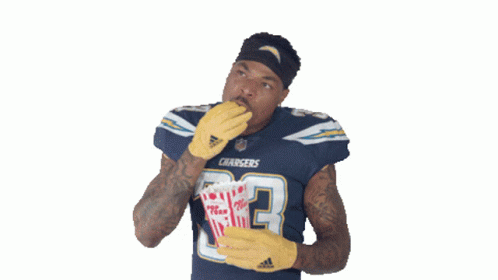 Paglalarawan ng Content: a man wearing a chargers jersey holds a bag of popcorn