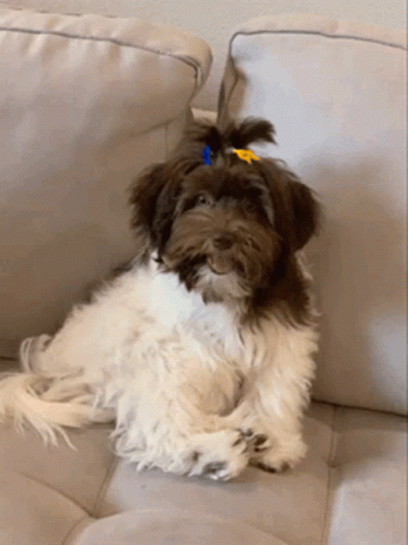 Paglalarawan ng Content: a small brown and white dog with a blue and yellow bow in its hair