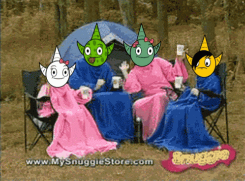 Paglalarawan ng Content: a group of people wearing blankets with cartoon faces and the website www.mysnugglestore.com in the background