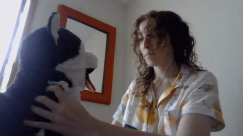 Paglalarawan ng Content: a woman petting a stuffed animal in front of an orange mirror
