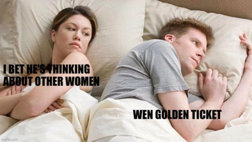 Paglalarawan ng Content: a man and a woman are laying in bed with a caption that says i bet he 's thinking about other women wen golden ticket