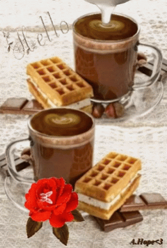 Paglalarawan ng Content: two cups of coffee with waffles and a red rose with the word hello written on it