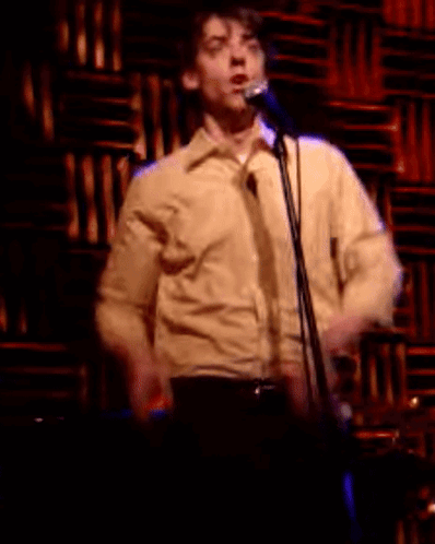 Paglalarawan ng Content: a man in a yellow shirt is singing into a microphone on stage