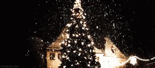 Paglalarawan ng Content: a christmas tree is lit up at night and snow is falling around it .