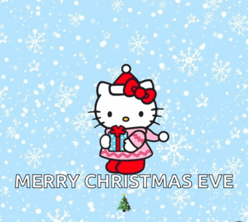 Paglalarawan ng Content: a hello kitty holding a gift and the words merry christmas eve below her