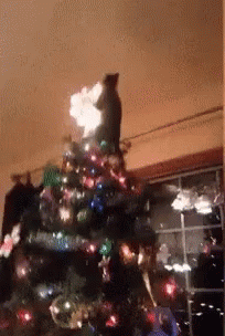 Paglalarawan ng Content: a cat sits on top of a christmas tree