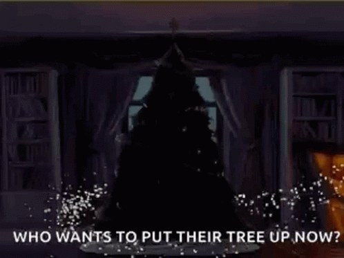 Paglalarawan ng Content: a cartoon of a christmas tree with the words who wants to put their tree up now .