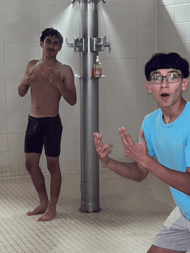 Paglalarawan ng Content: a man in a blue shirt stands in a shower