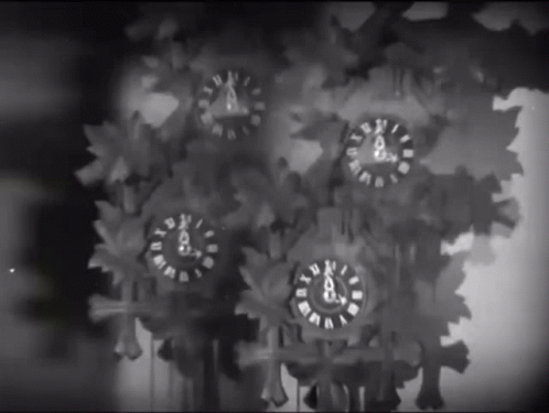 Paglalarawan ng Content: a black and white photo of a cuckoo clock with the hands on the number 8