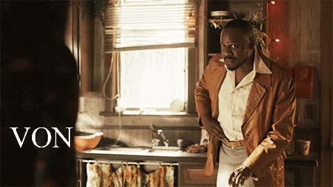 - Paglalarawan ng Content: a man in a brown leather jacket is standing in a kitchen with the word von on the bottom right