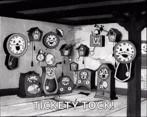 Paglalarawan ng Content: a black and white cartoon of a room filled with clocks and the words `` tickety tock ! ''