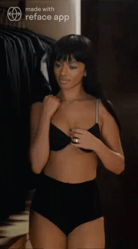 Paglalarawan ng Content: a woman in a black bra and panties is standing in front of a closet .