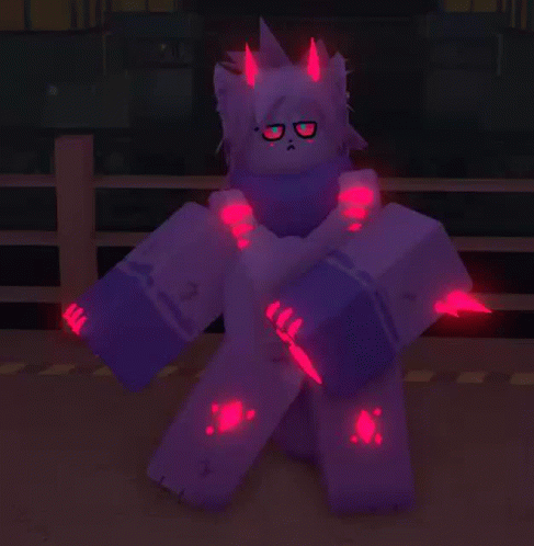 Paglalarawan ng Content: a purple cat with horns is standing in a dark room with pink lights on its arms .