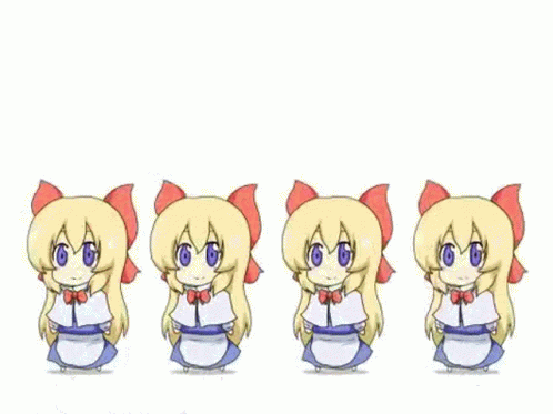 Paglalarawan ng Content: a cartoon of a little girl with blonde hair and red bows standing next to each other .