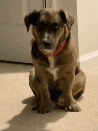 Paglalarawan ng Content: a brown dog wearing a pink collar is sitting on the floor
